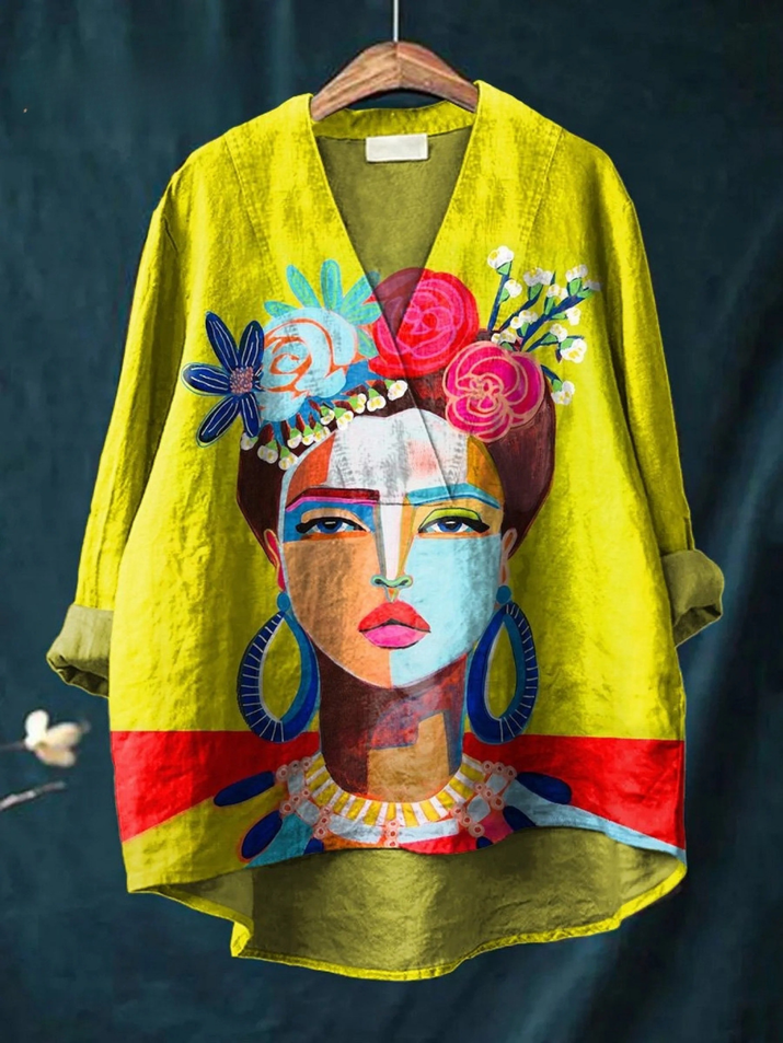 Oil Painting Freda Portrait Art Printed Women's Casual Cotton And Linen Shirt