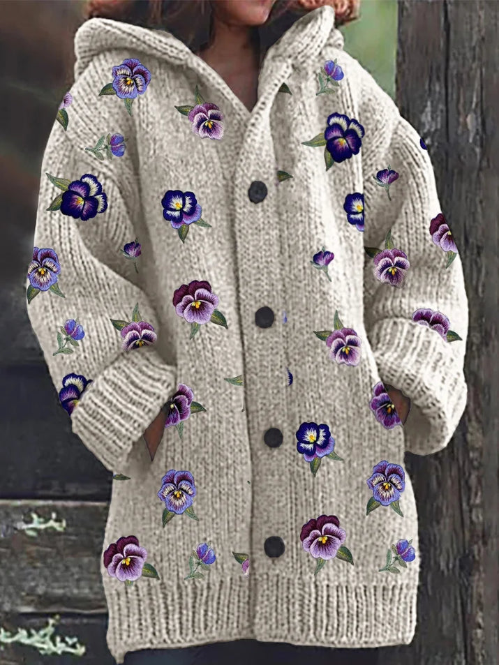 Pansy Floral Embroidery Pattern Cozy Hooded Cardigan