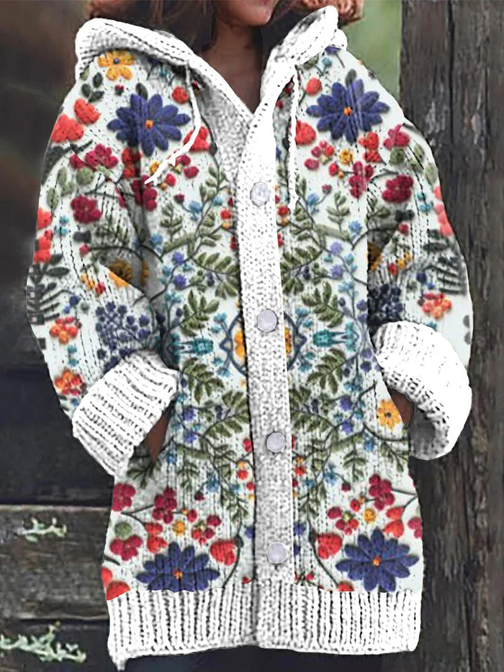Vintage Floral Embroidery Pattern Cozy Hooded Cardigan