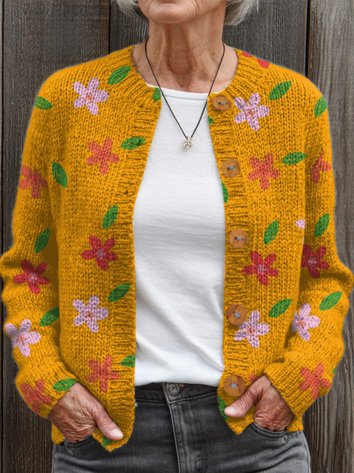 Vintage Flower Art Print Buttoned Cardigan Sweater